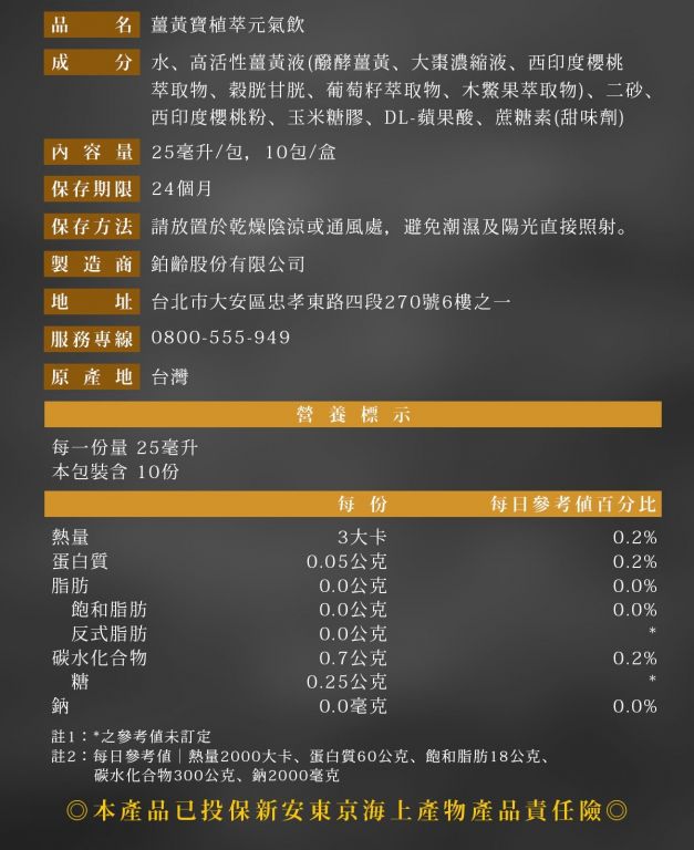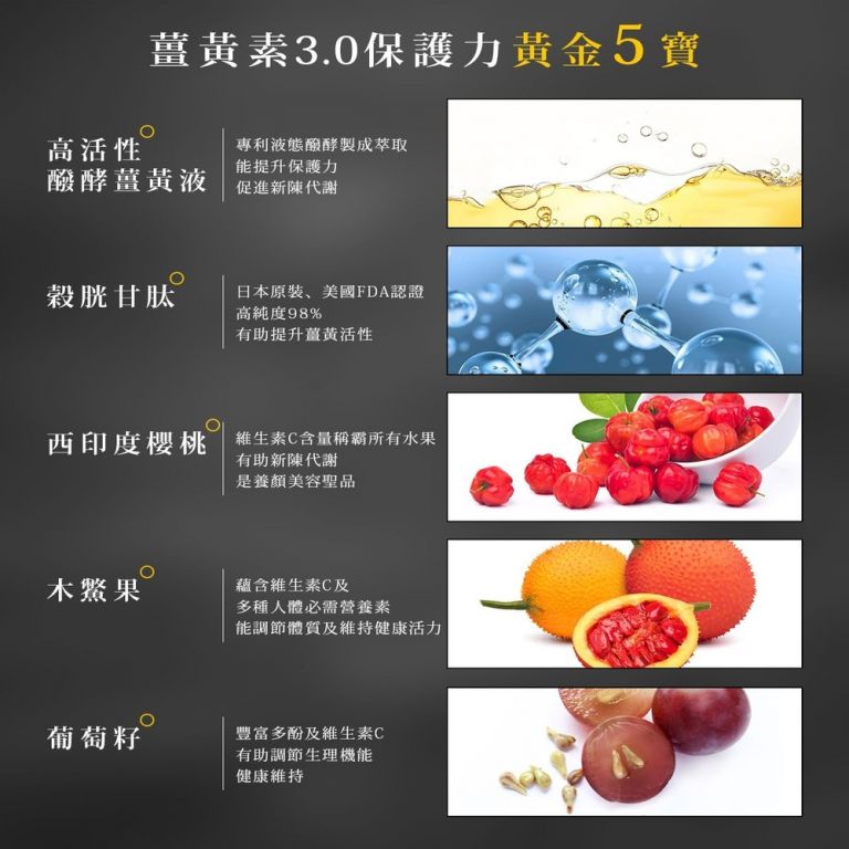 5. 嚴選配方 好健康:嚴選黃金五寶 - 高活性醱酵薑黃液, 額外添加日本原裝,FDA認證, 98%高純度的「穀胱甘肽」,有助提升薑黃活性; 另有多種植化素精華, 如木鱉果, 西印度櫻桃, 葡萄籽萃取物, 含維生素C, 具抗氧化作用 。