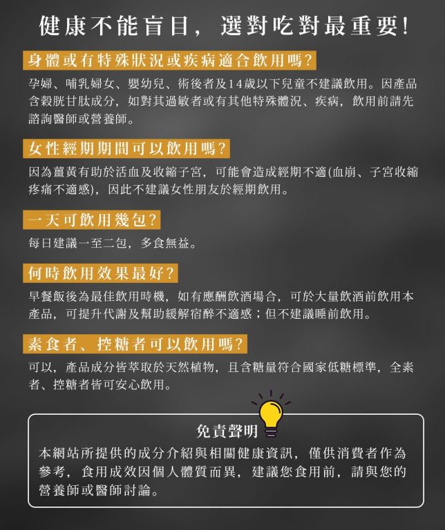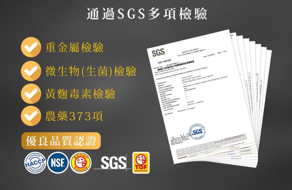 4. 健康訴求 好安心:全素食可。市售唯一符合衛生署公告的低糖薑黃飲,輕鬆無負擔。全程MIT, 並通過多項SGS檢驗認證